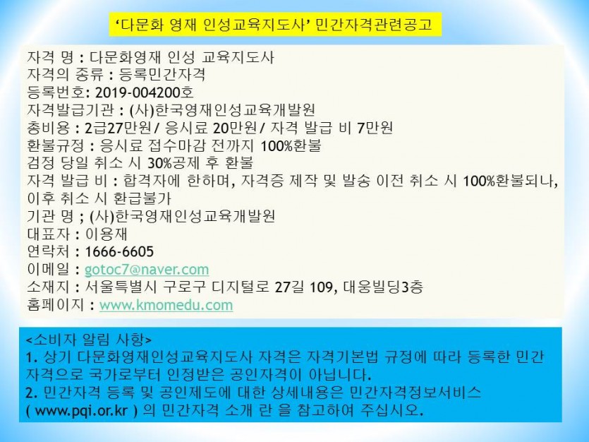 1. 상기 다문화영재인성교육지도사 자격은 자격 기본 법 규정에 따라 등록한 민간 자격으로 국가로부터인정받은 공인 자격이 아닙니다.