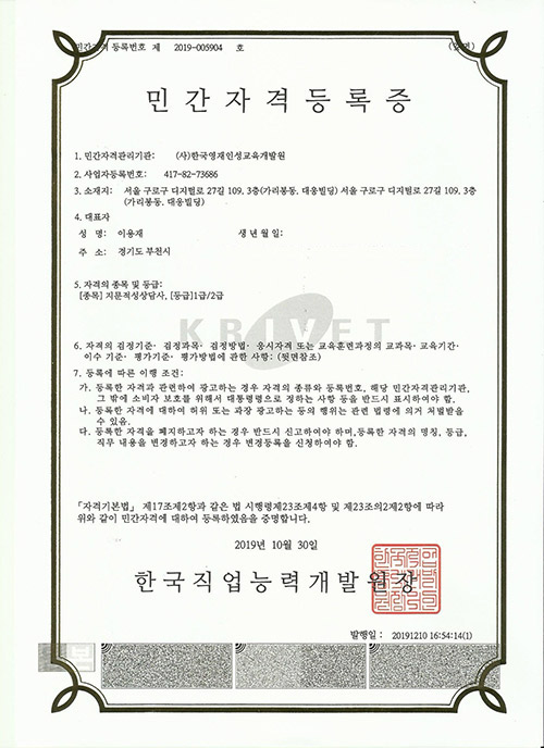 등록번호: 2019-004200호 / 자격 발급기관 : (사)한국영재인성교육개발원